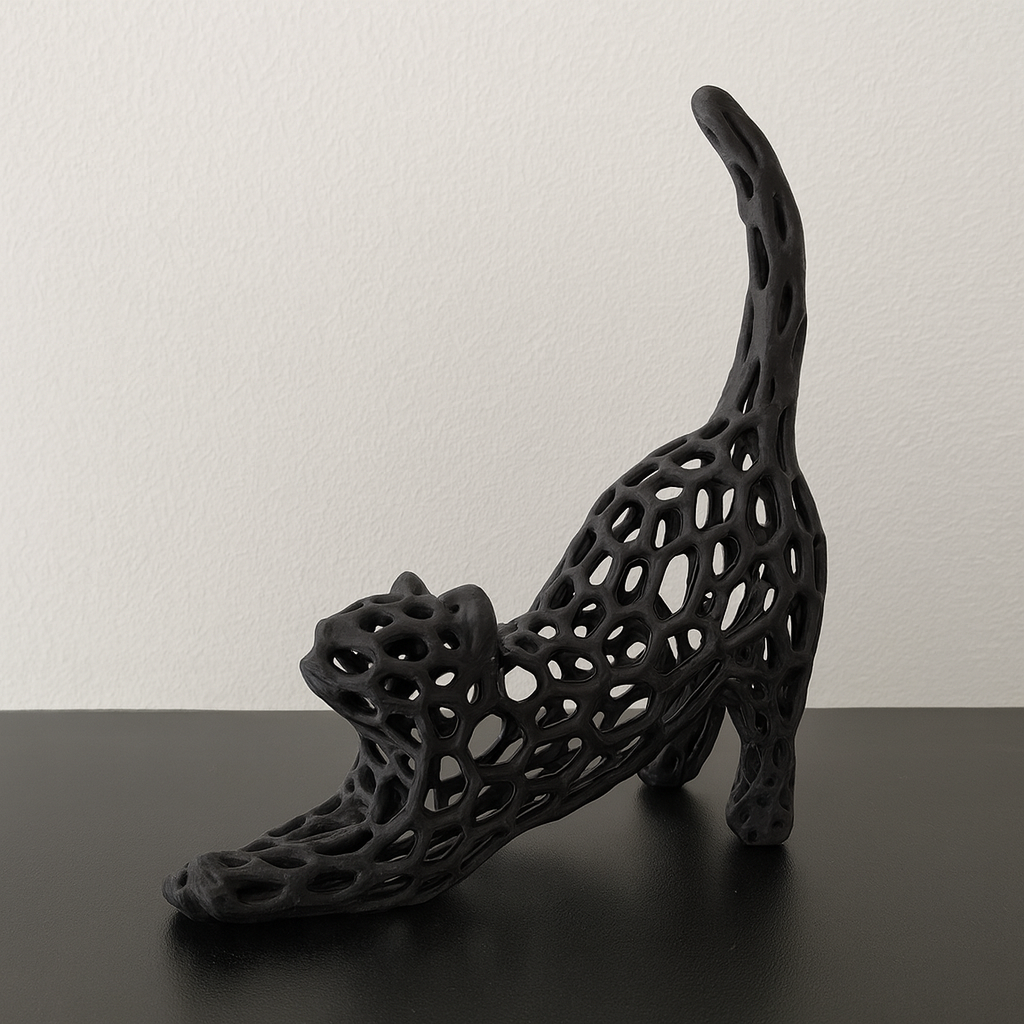 „Stretching Cat” to oryginalna figurka przedstawiająca kota w dynamicznej pozie rozciągania. Ażurowa konstrukcja nadaje jej lekkości i artystycznego charakteru, dzięki czemu idealnie pasuje do nowoczesnych wnętrz. To dekoracja, która wnosi odrobinę energii i kreatywności.